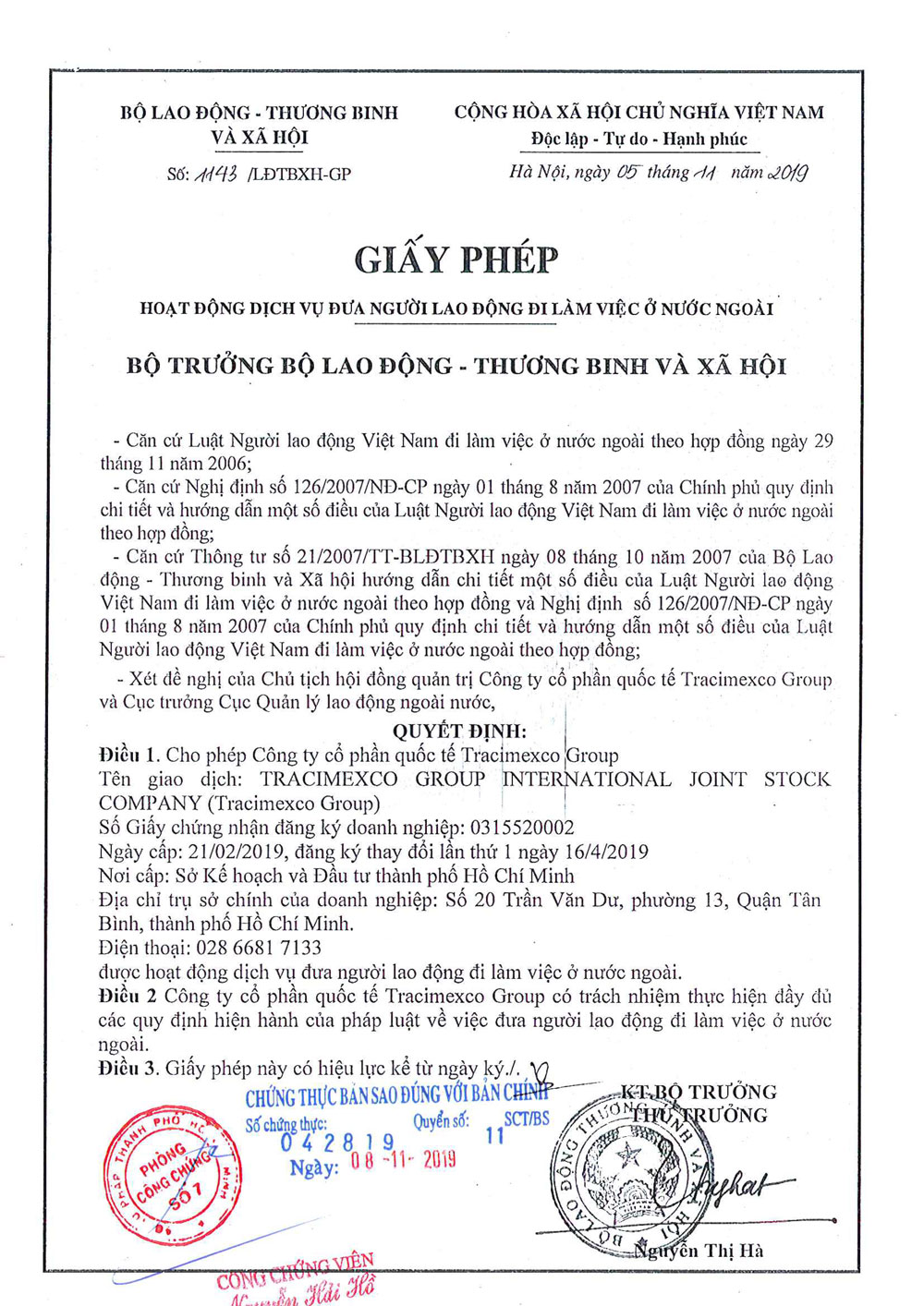 Công ty cổ phần quốc tế TRACIMEXCO GROUP hoạt động trong 5 lĩnh vực chính: Xuất khẩu lao động, Tư vấn du học, Đào tạo ngoại ngữ và Tư vấn đầu tư với thị trường trọng tâm là Nhật Bản.
